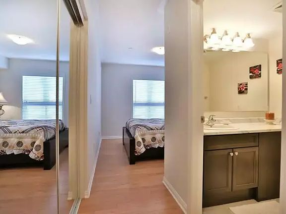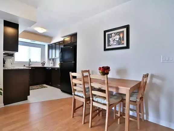 Featuring 2 bedrooms & 2 full baths, this unit is upgraded with quality laminate floors throughout except where ceramics. Living/dining room offers walkout to the balcony. Nicely appointed kitchen features dark espresso coloured cabinets, granite counters & new appliances. Master bed has a large closet & 3 pc en-suite. Suite has its own forced air central AC & heating units