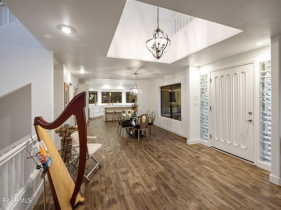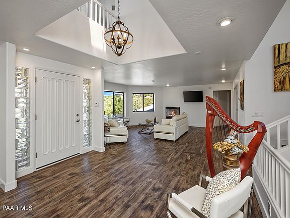Step into this exquisite 2,859 sq ft home, nestled in the coveted Hidden Valley Ranch community, and prepare to be captivated by its fully remodeled interior. Tucked away in the tranquil Pines of Prescott, this residence offers a picturesque retreat just minutes from the vibrant downtown area. Prepare to be amazed as you gaze out from every window, where panoramic views of Granite Mountain and the twinkling city lights of Prescott create a stunning backdrop to everyday living. The upper level boasts the luxurious main suite, a haven of relaxation and tranquility. Step out onto the balcony and take in the breathtaking surroundings. The spacious bathroom features dual sinks, an enchanting gas fireplace, and large walk-in closet, providing ample space for all your wardrobe needs. The main