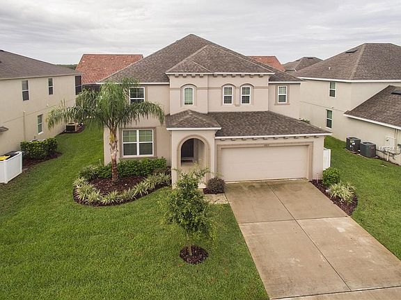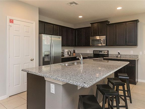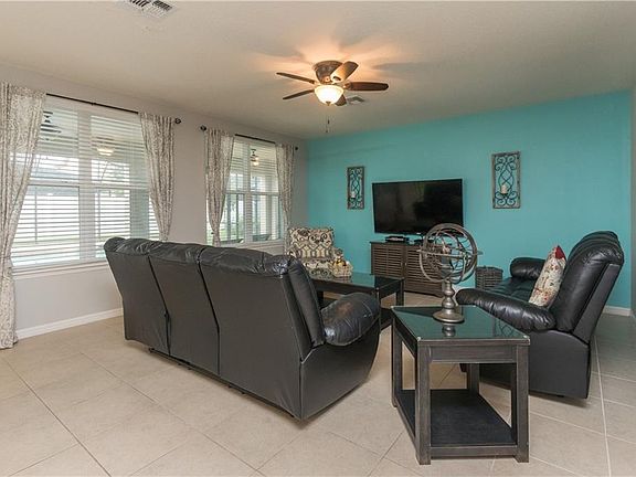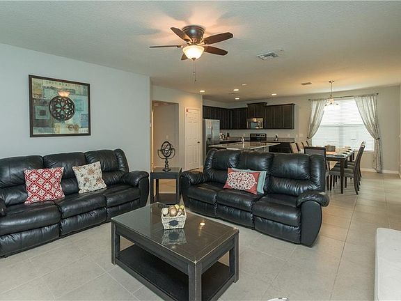 Welcome to your FULLY FURNISHED "Beazer" home offering excellent curb appeal, heated pool/spa, and plenty of space. Don't miss your chance to own this RARE FIND in a popular gated community zoned for short term rental or primary residency. Boasting 7 bedrooms and 5 baths, this stunning home features several en-suite bedrooms (2 downstairs) plus bonus room. Inviting foyer leads the way to an open floor plan perfect for family gatherings or entertainment. Impeccable kitchen featuring 42" Espresso cabinets w/crown molding, stainless steel appliances, granite counter tops, large island and dining area that flows seamlessly into a spacious great room. Journey upstairs to 5 additional bedrooms and 3 baths, to include Jack n Jill en-suite. Master suite provides dual sink vanity, large shower and walk-in closet. Generous bonus area is great for relaxation (sleeper sofa), movie night or game day. Enjoy a backyard retreat while swimming in your sparkling heated pool/spa with paver deck and covered lanai for dining al fresco. Upgraded features include 18" tile throughout downstairs living area, high-end furniture package, wall-mounted televisions, custom paint, Elustra solid surface vanity tops in all bathrooms, and Brunswick slate pool table. Situated near Theme Parks, this manicured community offers tennis courts, pool, sand volleyball, playground, and clubhouse w/fitness center, ping pong and kitchen for private parties. HOA includes owners lawn maintenance and basic cable. Call today for private showing.