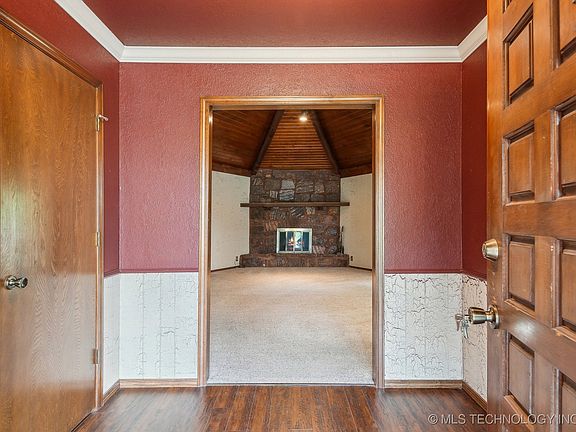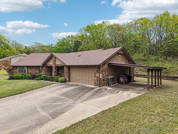 This beautifully well maintained 3-bedroom, 2-bathroom home is ideally situated in a prime central location, offering peaceful, scenic views. Step into the inviting living room, where a striking stone fireplace and a dramatic round vaulted ceiling with rich wooden beams create a warm and distinctive architectural focal point. The kitchen is thoughtfully designed for both style and functionality, featuring granite countertops, a central island ideal for meal prep or casual dining, and abundant upper and lower cabinetry for ample storage. The spacious primary suite includes a private bathroom and an additional room-perfect for a home office, nursey, or creative space. Outside, the home showcases excellent curb appeal, highlighted by a charming front porch that sets a warm welcome. The backyard is a private retreat, complete with a covered wraparound patio and a concrete sitting area-perfect for entertaining, reading a book, or relaxing evenings surrounded by nature. Additional features include a convenient carport, a two-car garage, and a separate storage shed-offering even more space for tools, equipment, or seasonal items. Walking distance to the YMCA and 35 minutes to Tulsa. Additional lot included Parcel # 1322-00-003-001-0-003-00