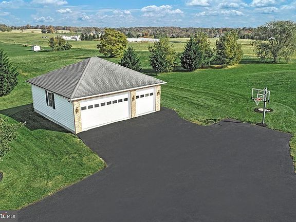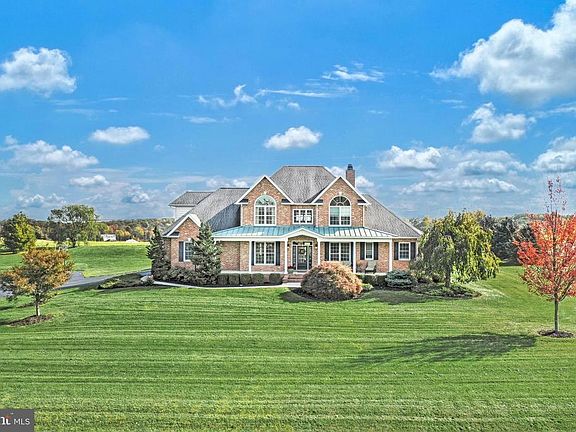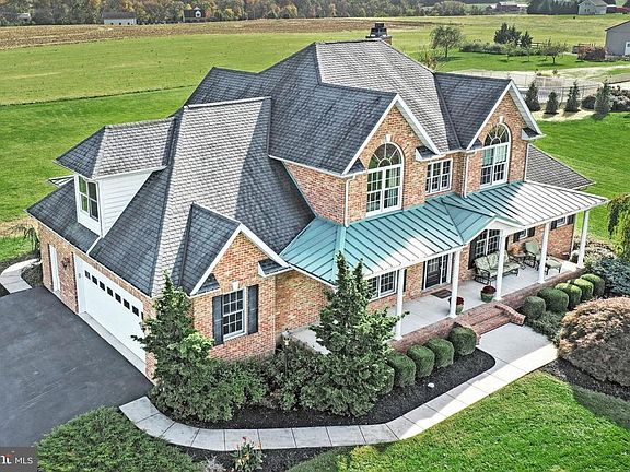 Looking for a quiet, rural setting with a panoramic view of fields and trees? This property boasts of 4.21 acres with a beautiful brick house, 5 bedrooms, 3-full and 2-half baths, 3637 square feet, and a large partially finished basement. The entrance and most of the downstairs has Brazilian Cherry hardwood floors. The library/office is all you need to work from home with built-ins and large windows overlooking the front lawn. The great room is perhaps the most stunning part of this home with cathedral ceilings, a 2-story stone, wood burning fireplace. The kitchen is right off the great room and features a breakfast bar, double oven and an eat-in dining area with built -in bench seating. The formal dining room off the kitchen has chair railing and a lovely coffered ceiling. Adding to the main floor is a half bath with an outside entrance handy for a backyard pool. The laundry room also has countertops and built-in shelves. The primary bedroom is on the first floor and features a lighted tray ceiling, sitting area, 2 walk-in closets, a primary bathroom with granite, double sinks, a shower and a tub with jets. Go through the double doors from the primary bedroom to your own private sunroom that has a 4-person hot tub that conveys with the home. Upstairs bedroom 2 has its own full bathroom and a walk-in closet with vaulted ceilings. Bedroom 3 and 4 also have vaulted ceilings and include the window treatments. Bedroom 5 can be used as a bedroom or a bonus room. The basement is partially finished and is the ultimate man/woman cave. It boasts of a fireplace, recessed lighting and bar and that conveys with the home. Additionally, there are 2 large storage rooms off the finished basement. The outside of the home features a lovely front porch with pillars and plenty of places to relax with your morning coffee. The back porch is also covered and is the perfect place to do your outside entertaining, have your meals and grill with a beautiful background of fields and trees.