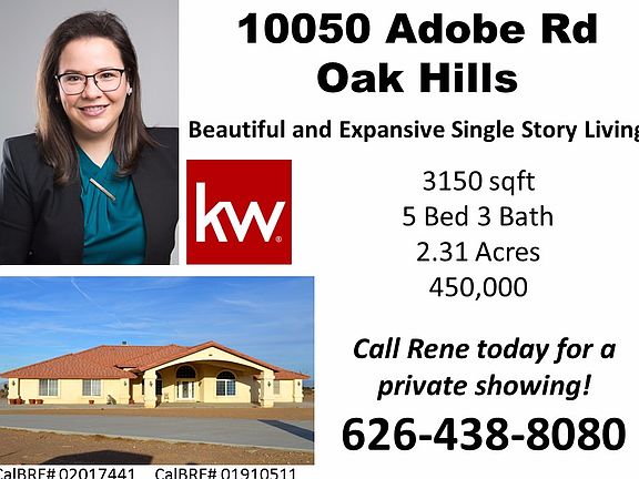 This 3150 square foot single family home has 5 bedrooms and 3.0 bathrooms. This home is located at 10050 Adobe Rd, Oak Hills, CA 92344.
