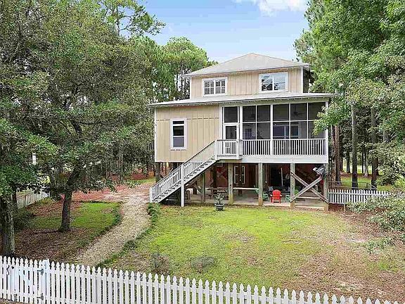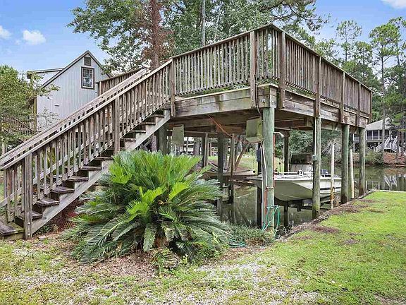 Truly amazing CANAL FRONT home with easy boating access to Weeks Bay, Fish River and Mobile Bay. 5 bedrooms/4 full baths with numerous high-end appointments, a large covered boat dock with two lifts and a sundeck, and a low maintenance metal roof. The impressive main level showcases the open floor plan, gorgeous wide plank pine flooring, beautiful canal views, and a stunning fireplace. Large kitchen with an island, abundant custom cabinetry, and granite countertops. Designer lighting, and upscale plumbing fixtures throughout. Additional room adjacent to the kitchen/dining makes a great space for an office, small second den, or kids game room. Two bedrooms on the main level, three bedrooms on the second level, and a ground floor room with a full bath that could be a den, man cave, office, or a mother-in-law suite. The large, private master suite includes a view of the canal and an ensuite bath with double vanities, his/her closets, spacious walk-in shower and a whirlpool tub. The second bedroom has an extremely large walk-in closet and adjoining bath with claw foot soaking tub. This home has fantastic outdoor entertainment areas, including a large screened back porch with two ceiling fans and that overlooks the canal, spacious covered patio area underneath the house, white picket fence in the backyard, and an oversized sun deck on top of the boat house. Highly desired covered boat dock, with two lifts, bulkhead, water, power, sun deck and an outdoor shower, plus is only steps away from the main house. Just a great serene setting for your family gatherings. Large lot with beautiful trees, a childrens play area, and a fenced area that provides abundant space to store your boat trailer or RV. Furniture and boat also can be separately purchased.