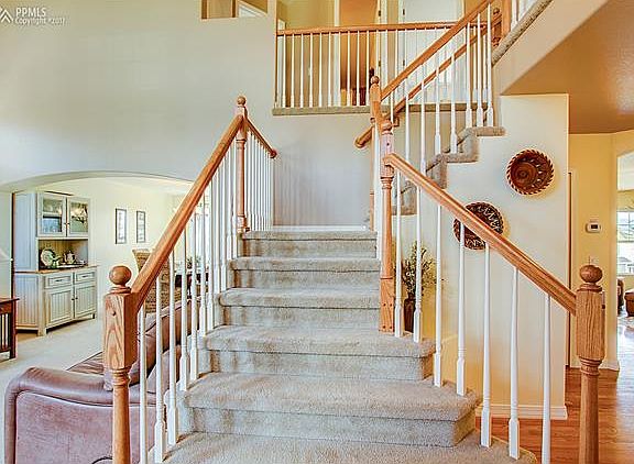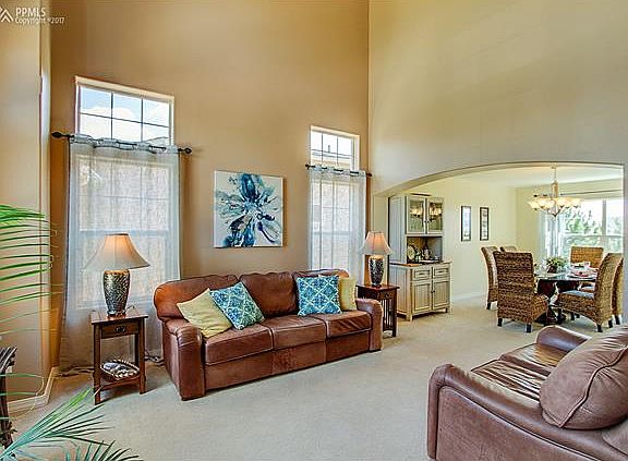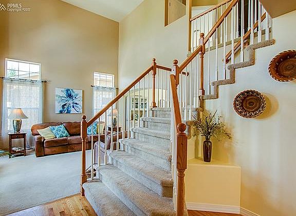 This custom style landscaped 6 bedroom 3.5 bath home in D-20 promises the best of Colorado living in the highly desirable Pine Creek neighborhood. As you enter the home you are greeted with vaulted ceilings and windows to provide natural lighting with an open welcoming flow of movement through a sitting and formal dining area. The open kitchen and family room offers a spacious pantry, kitchen bar, wood floors and fireplace. The kitchen offers access to the deck with Colorado worthy (See supplemental remarks) mountain views and quaint outdoor living space. The second story features a master suite in addition to three bedrooms and a laundry area. The finished walk-out basement is completed with a rec room, 2 bedrooms, full bathroom and extended back patio access. Finishing with 95 sq. ft. of additional storage space to the oversized two-car garage. Easy access to Powers and I25 make this the perfect location to get anywhere in the city quickly and easily.