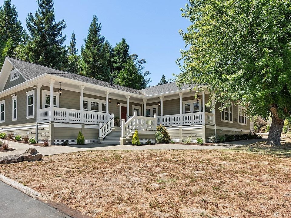 Located in the rolling green hills of West Sonoma County Wine Country in an exclusive parklike setting is this stunning country home, complete with a wrap-around porch overlooking 2.25 acres of natural beauty and walls of sunlit glass that frame pleasant park-like views. Designed for entertaining on a grand scale, this home boasts a great room with tall ceilings and a chef's gourmet kitchen and a cozy enameled gas stove. The sumptuous primary suite features a beautifully tiled primary bath complete with a tub and shower. Rich newly refinished hardwood flooring, beadboard wainscotting and elegant trim elevate the quality of this home. The detached guest quarters are a bonus, as well as a multitude of mature trees, including a variety of producing fruit trees. Don't miss the dreamy outdoor chef's kitchen, complete with a high-quality pizza oven. The close proximity to the charming hamlet of Graton and thriving and colorful downtown Sebastopol make this Wine Country Living at its finest.