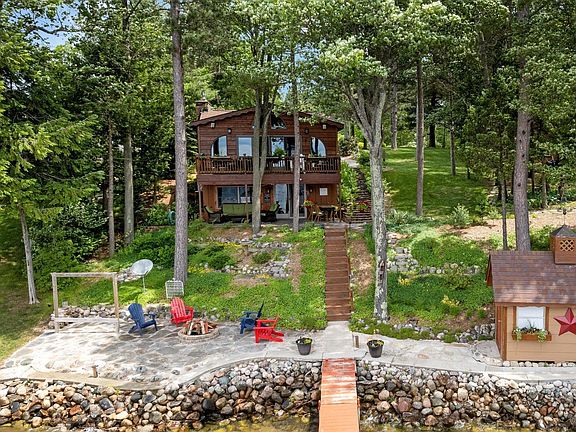 This charming lakefront property offers 100 feet of sandy frontage on the All Sports Fife Lake, perfect for water enthusiasts. The beautifully landscaped grounds, adorned with flowering bushes and shrubs, provide stunning views of the water. This 2-bedroom, 2-bath home features a finished bonus room over the garage for additional living space.The main floor boasts an island kitchen, hardwood floors, spacious living room, full bedroom, bath and sliding doors that lead to a private back deck overlooking the lake. The walkout lower level includes a cozy family room with a fireplace, an additional bedroom, a full bath, and sliding doors that open to a stamped concrete patio area with a firepit, perfect for lakeside gatherings. The property includes a 2-car garage with a hardwood-floored bonus room above, featuring tongue and groove ceilings. For storage, there are two sheds: one near the water for beach toys. This home is ideal for year-round living or as a vacation retreat. Enjoy endless hours of water activities and the tranquility of lakefront living in this delightful home. Located just 30 minutes from Traverse City and 20 minutes from Cadillac, this home offers easy access to nearby amenities.