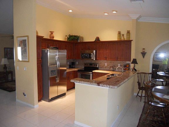 This home is immaculate and has been extremely well maintained. It has been professionally decorated with many upgrades which include: A six-year young barrel roof with two additional vapor barriers, a four-year young Rheem 15 seer air conditioner. Kitchen was remolded three years ago; included in the remodel are all Maytag stainless steel appliances a microwave/convection oven and granite countertops with breakfast bar. The covered screen patio provides access to a beautifully landscaped/priv