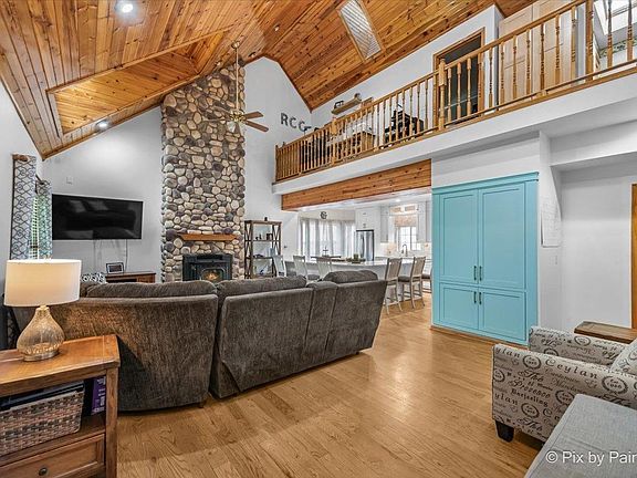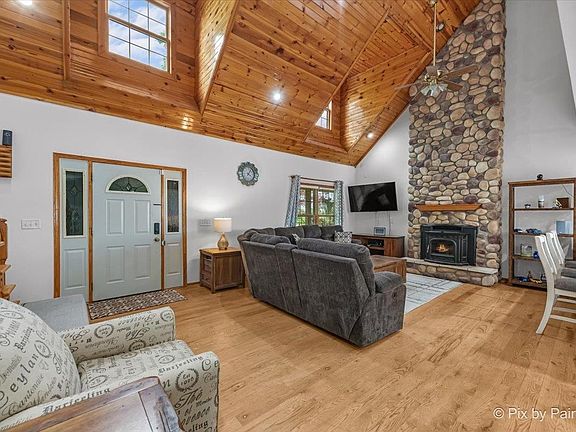 Updated 3BR/2.5BA home on 1 acre Fully remodeled kitchen w/ quartz counters Vaulted ceilings + skylights Luxurious primary suite w/ quartz-finished bath 36x40 workshop w/ heated floors, water & air lines Energy-efficient Hawken outdoor wood boiler Hardwood floors + 2-story stone fireplace 2-car attached garage + large detached workshop School bus stop in front of property