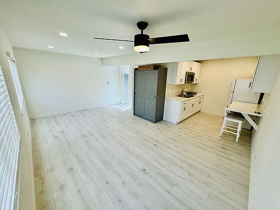 Discover modern living in this completely renovated studio located in the coveted Chateau Blanc community in Fountain Valley. This tastefully updated upstairs studio features a brand-new kitchenette with premium cabinets, quartz countertops, a stainless steel sink and faucet, a stainless steel microwave, a hot plate, and a new refrigerator. A custom-built counter provides the perfect space for work or dining, adding both functionality and style. Luxury vinyl plank flooring ensures easy upkeep, while recessed lighting and a ceiling fan enhance the modern ambiance. The bathroom has been completely remodeled with a new quartz countertop vanity, a new toilet, and a sleek standing shower. As a resident of Chateau Blanc, you'll enjoy access to fantastic amenities, including a sparkling swimming pool, a clubhouse, a tennis court, a playground, a half basketball court, and serene green belts. One parking space in the shared two-car garage is included, along with shared laundry privileges and utilities covered up to $250 per month. This charming studio offers modern convenience and comfort don't miss your chance to call it home! Apply today! One year term. No Smoking of any kind on the property. No Pets will be considered. Landlord lives in front unit and will take care of monthly utilities up to $250/month. Wifi is studio tenant's responsibility. Tenant will have one car space inside two car garage. Laundry will also be shared with the front unit. ONLY ONE RESIDENT TO BE CONSIDERED.