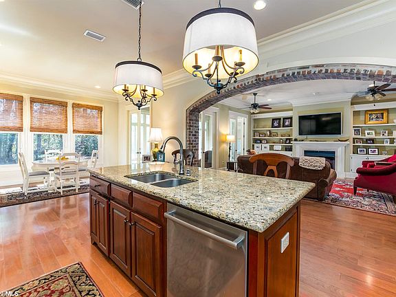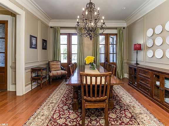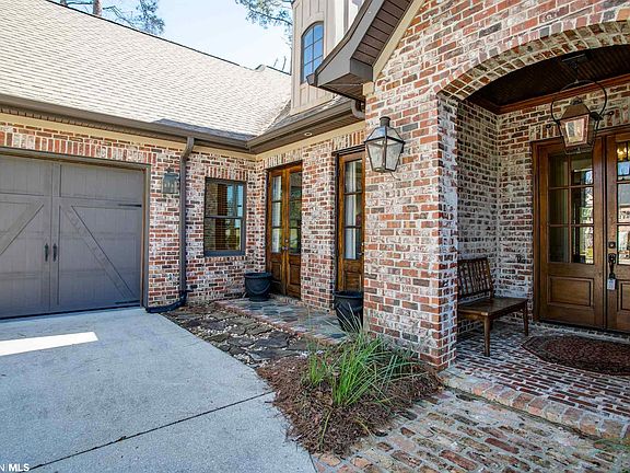 You have to see this fabulous French-Country estate home situated in the sought-after Woodlands of Malbis subdivision in Daphne. Convenient to I-10 for commuters, this single street community with stocked ponds welcomes you home to a serene location. Set on a large lot with mature trees, this brick home is a show-stopper with its gas lamps and inviting foyer. Once you enter through the grand front door, you'll notice the beautiful hardwood floors, custom 12' crown moldings and incredible consideration to design throughout the home, with high ceilings and 8' doors. The formal dining room with wainscoting paneling is just off the foyer that leads to the large great room adorned with gorgeous built-ins surrounding the gas log fireplace and overlooking the back yard through the sunny Florida room. From this Great Room, pass through a beautiful, exposed brick archway accented by carriage lights, opening into a warm gourmet kitchen. Enjoy cooking and hosting gatherings at the island bar and in the breakfast nook. Kitchen has Thermador and Sub-Zero appliances along with custom wood cabinets and natural stone counters, topped with a stately full vent hood. The Master-Suite on the main level includes dual vanities, custom cabinetry, a deep soaking tub, separate tiled shower with a seat, and two spacious walk-in closets with built-ins. The bedroom is lit with sunny southern windows framed by custom drapery. Two other downstairs bedrooms have private vanities and share a 2nd split bathroom. Also downstairs is a respectful guest suite with its own private bathroom. Adjacent to the kitchen is a convenient powder room for guests, near the office tastefully adorned with French doors. Upstairs is another guest bedroom and 4th full bathroom, relaxing den, and media room. There is ample attic access and plenty of storage space, from closets to built-ins. The over-sized attached double garage has even more storage space. Pond view & firepit in partially fenced backyard.