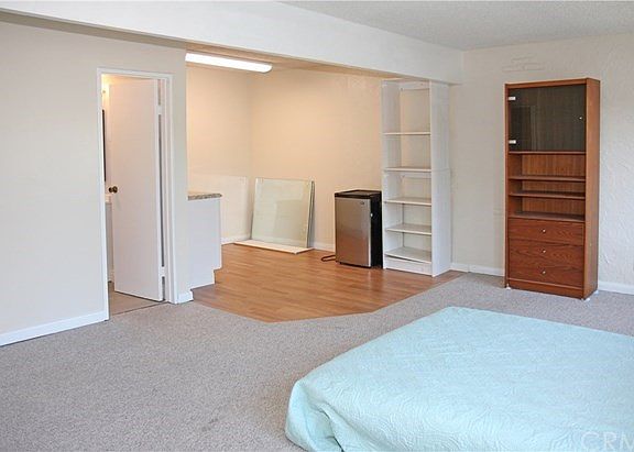 Spacious Studio Apartment with Open Floorplan, Upstairs from Garage. Plenty of Room for a Full Living Area and Bedroom Area that is Carpeted. Brand New Dual Pane Windows, Wood Laminate Flooring Separates the Kitchen Area with Room for Dining Table and Chairs. Kitchen Area has Countertop and Sink with Space for Microwave and Hot Plate. Small Refrigerator is Provided. The Bathroom is Completely Remodeled with Newer Vanity, Tile Flooring, and Walk-In Shower with Tile Walls that Look like Carrera Marble with Tile Inlay and Clear Glass Shower Door. There is a Toasty Wall Heater. Utilities are Included and so is One Parking Space in Garage. Steps to Playground, Pool, Spa, Sports Court, Tennis, Clubhouse, and Tons of Walking Paths Through Greenbelts. Approximately 4.5 Miles to Beach. Walking Distance to Shopping and Dining. Close to Award-Winning Schools.