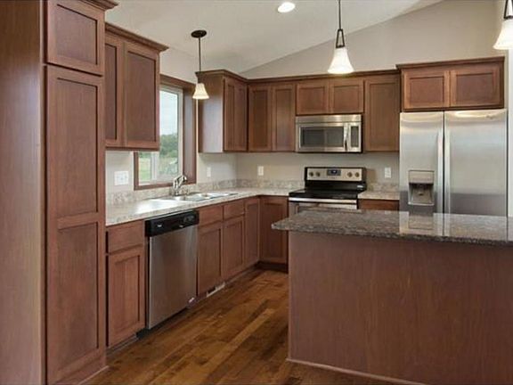 This home has a 2-sty open foyer with wood trim. Wood floors in kit & DR along w/granite tops on island, roll out shelves, lazy susan & recycle bin. Master BR has 5 ft shower w/tile walls. Wired for wall TV's in all BR. Full walk out basement.