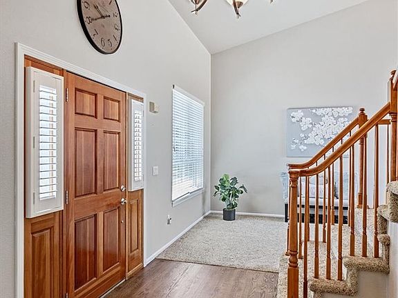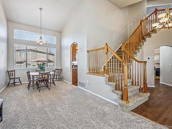 Absolutely gorgeous Mansion Pointe home with 5 bedrooms, 4 bathrooms, a main floor study, and a finished basement! An elegant staircase with wood banister and spindles greets you from the entry! To the left is a huge formal living/dining room with vaulted ceilings, and tucked behind glass French doors on the right, is the main floor study! Gleaming hardwood floors lead to the kitchen with TONS of 42-inch custom cabinets with crown molding, glass fronts, and soft-close drawers and doors, granite countertops and backsplash, and all stainless steel appliances! A large window overlooks the backyard, and a glass sliders leads to an extended concrete patio - perfect for summer gatherings with friends and neighbors! Adjacent to the kitchen is the family room with a charming gas fireplace and ceiling fan! A 3/4 bath and laundry room completes the main level! Upstairs is a sizeable master suite featuring a large walk-in closet and a private 5-piece bath with double vanities, granite countertops, tile flooring, soaking tub, oversized glass shower, and a private water closet! Three more bedrooms on the upper level share a full hall bath! The basement has been professionally finished with a rec room, 5th bedroom, and a 3/4 bath! Perfect for guests! Extra special features include turf in the backyard, tankless water heater, and conveniently located across the street from an access point to the miles of walking trails for Highlands Ranch!