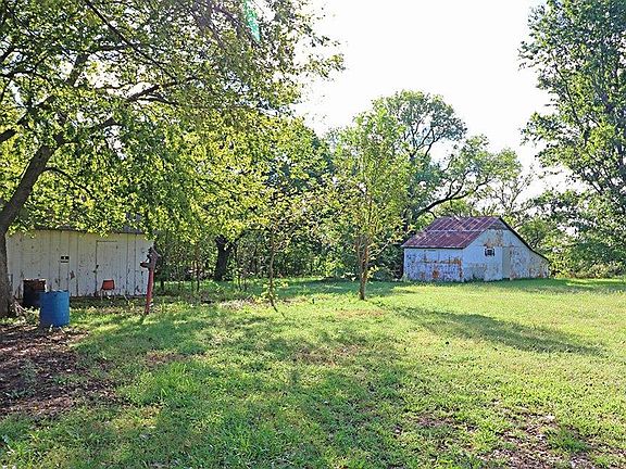 This farmhouse has the potential to be a show place...just needs some TLC. So many shade trees and a creek fed pond that seller says has never gone dry and is reported to be quite deep. The west end of the house is the original home and over 120 years old, and was added on to in 1965. Vinyl siding put on and new roof in 2009. Two wood burning fireplaces, the one on the west end of the house was never used by this seller. Central heat and air installed in 2007. Two bedrooms downstairs, and two bedrooms upstairs. Both bathrooms are downstairs. Big open kitchen with snack bar. There are so many cabinets for storage too throughout the house. Great sun porch on the front and covered deck on the east side of the property. The barn has an attached chicken coop and lean to attached. Kansas Gas Company for the heat, so no propane tank to keep filled.