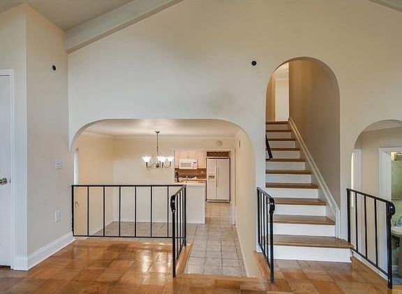 Striking split-level design ready to move-in. Fresh paint & new carpet. Separate dining room & large breakfast area. Vaulted ceiling in spacious den with original wood flooring. Kitchen, windows, roof, baths & AC have been upgraded but are not new. Includes refrigerator, washer, dryer & window coverings. Nice yard with flowering trees & bushes, covered patio, rear yard access & parking for 3+ cars. Termite contract, HWA Warranty. Elevation Certificate available. Irregular corner lot approx 100'x60'