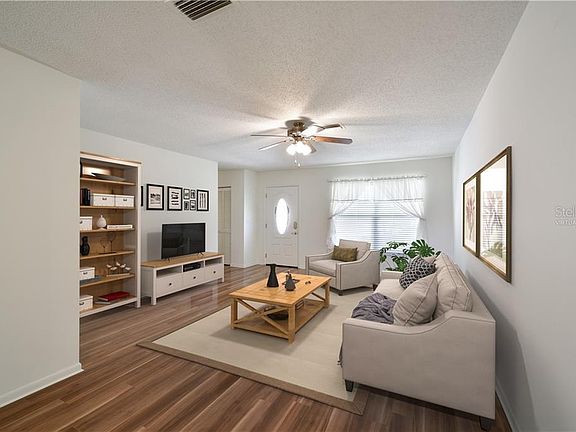 This 3 bedroom 2 bath Village Green home is warm, welcoming and simply charming! You're sure to appreciate the generously sized 25' x 10' living and dining room with a floor plan that includes a family room, enclosed screened patio and two car garage. Additional details showcase an attractive glass entry door, farmers sink, two sliding glass doors that access the patio, tilt in windows, two walk in closets, laminate and ceramic tile flooring, ceiling fans, second bathroom tub, pass thru kitchen window to patio, pantry closet and great storage options. Exterior features include an extra nice storage shed and an exterior that has been freshly painted, 2019 water heater, garage cabinetry, 2016 seamless gutters, sprinkler system, fully fenced in yard, 2012 A/C with UV light and 2006 roof. This home has curb appeal! The grounds have been lushly landscaped showcasing a colorful array of plants and shrubs including Foxtail and Royal Palm trees. Everything is move in ready and immaculate! Some rooms have been virtually staged.