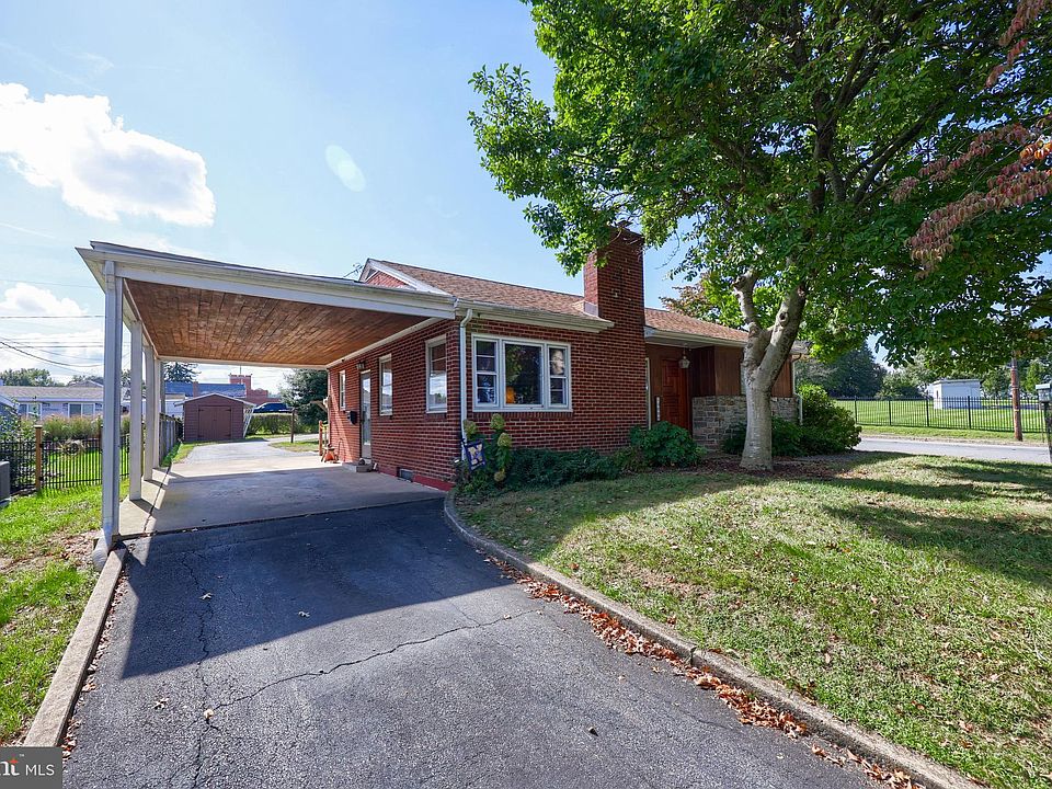 Detached brick ranch home with extra wide carport with side entrance leading into kitchen and lower level. This well maintained 2 bedroom, 2 bath home features a LR fireplace w/mantle and refinished oak floors, Berber carpet in both bedrooms, ample closet space and storage. First floor bath has refinished full tub and shower with vanity and large wall mirror. Linen closet and storage cabinets are in the adjacent hallway. 2nd floor unfinished area is accessed from the dining room. Lower level space offers a finished family room with wet bar, built in brick sand box for the kids to play. Long seated storage benches, recessed lights and knotty pine walls and cabinetry with low maintenance vinyl wood floors. The multi purpose separate laundry room has a sewing area, peg board, a desk and hidden double door pantry. 2nd bathroom offers a newer large shower stall, updated vanity, heat lamp in the the ceiling, and storage. The furnace room has updated mechanicals a workshop area and wall shelving. Exterior has 3 patios, with one under roof that is tiled and the other 2 are brick. This beautiful corner lot has a circular driveway and an extra lot 18 W x 60 L in rear of house. Wide street scape and a variety of well maintained homes surrounding the subject property. All of this and much more. All appliances and window treatments stay.