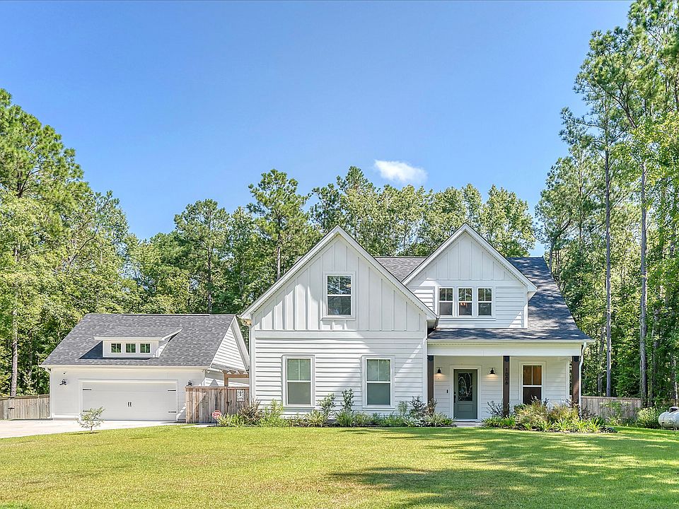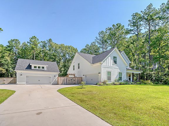 Welcome home to this stunning 2 year old modern farmhouse design in a gated community with the primary bedroom on the main floor, attached and detached 2-car garage, and large front and backyard on 1.42 acres. Located in Carolina Bay of Ridgeville, this lovely place has a ton of incredible features including hardiplank siding with a board and batton exterior finish, whole home generator, fully fenced in 1/2 acre+ backyard with the property line extending behind the fence, a shed for extra storage, welcoming front porch and custom covered back porch, extended concrete patio along the entire rear exterior of the home & garage, custom hexagon swing, and an extended driveway for extra parking. Interiorly you have your powder room and stairway upstairs upon entry; in the common areas of thehome is scratch and water resistant LVP floors extending all the way throughout including your gourmet style kitchen with ample counter space, wet island, stainless appliances, & gas range. The open floor plan boasts the kitchen flowing into the dining area, and living room with a custom built in and a ton of natural light. The laundry room is conveniently located down the hallway right across from your primary suite with en-suite and walk-in closet. Upstairs, you have 3 large bedrooms, one with an en-suite, an updated shared bathroom with double vanity, and a FROG upstairs that can used as a play room, 2nd living room, or easily be converted to a 5th bedroom. Outside is a huge fully fenced backyard with a ton of space to entertain. You've got to see this one in person to truly appreciate all it has to offer; schedule your showings today!