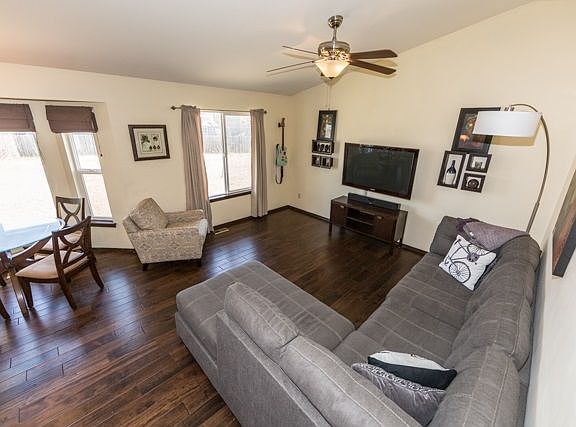 Darling ranch that is ready for you to move right into with beautiful hardwood flooring, light and bright kitchen tile backsplash, breakfast bar, under cabinet lighting, vaulted ceiling, and open to the living room to make entertaining a breeze, the inviting living room features beautiful hardwood floors, vaulted ceiling, and large windows overlooking the backyard. Spend restful nights in the spacious master suite with walk-in closet, vaulted ceiling with ceiling fan, linen closet, door to the screened-in patio, and private bathroom with separate tub and shower and his and her sinks. The finished basement is the perfect space to hang out and is complete with wet bar, carpeting, large daylight window, two spacious bedrooms, and a full bathroom. Sit back and relax this Spring out on the Screened in patio with two ceiling fans.
