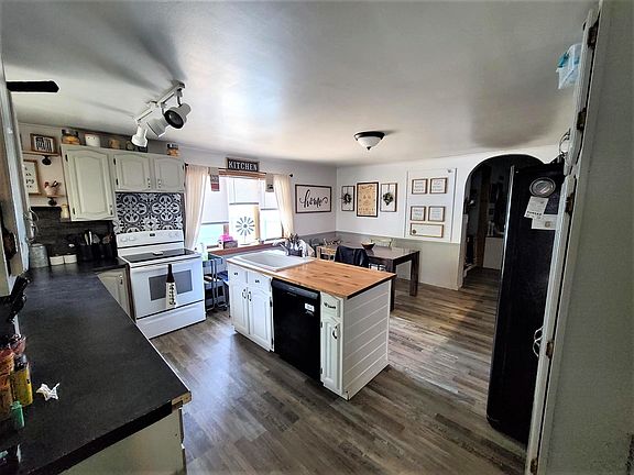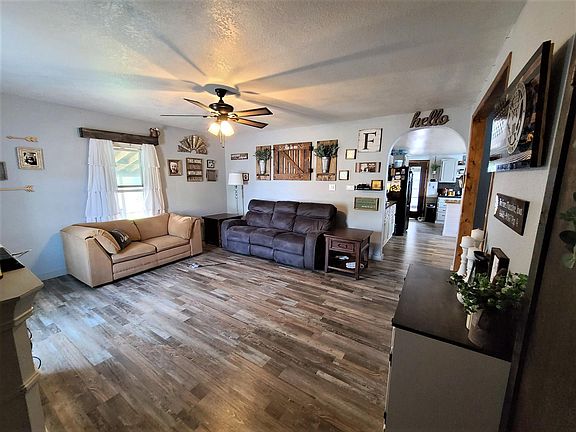 Enjoy this tastefully updated 3 bedroom home with large eat-in kitchen, main floor master suite, hobby room, laundry & sunroom. Huge 2 story garage is perfect for possible shop with upstairs that could be finished for many uses with furnace, electrical and potential water hookups. Main level of the garage is 1,440 SF. with 3 stall doors. This home also has brick patio in backyard, storage shed and front carport.