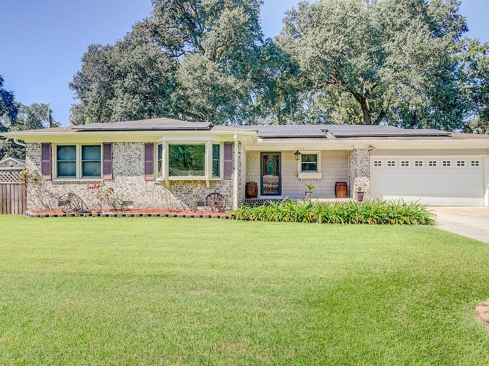 There's a lot to love about this ranch-style home on a spacious lot in Ladson! An impeccably groomed yard, pristine landscaping, a massive driveway (with room for 8 cars), and an inviting front porch greet you as you approach this lovely home. Enter through the mahogany front door to find fresh interior paint and new luxury vinyl plank flooring. The living room is a great place to relax and features a bay window to let the light pour in. The functional kitchen has stainless steel appliances and a bright and airy dining area with access to the covered porch. The owner's suite offers an en-suite bath with a step-on shower. Two additional bedrooms and a full bathroom with a dual sink vanity complete the interior of this home. The huge fully fenced backyard is a true oasis with a 20x18 coveredpatio with a stainless steel bar, lush, tropical landscaping, an above-ground pool with a 16x12 deck, and a storage building with a exhaust fan, lighting, and a concrete floor. This home includes 46 solar panels and Simontin windows. This property is conveniently located 5 miles from Historic Downtown Summerville, 8.8 miles from Nexton Square, and 11.4 miles from Charleston International Airport. Come see what makes this home so special!
