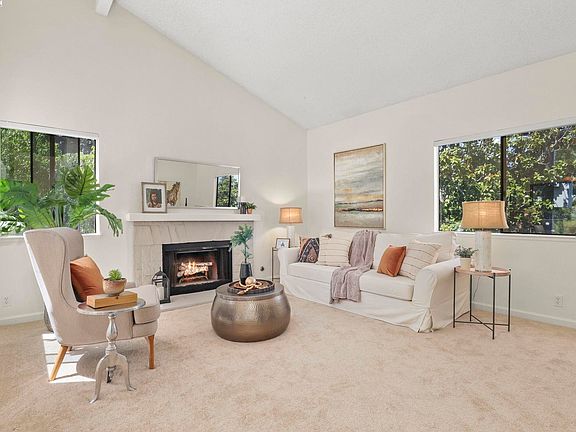 Welcome to this charming upper end unit in the sought-after Maywood Village! Bathed in natural light, this beautifully updated home features fresh interior paint and new plush carpet. The inviting open-concept living area boasts vaulted ceilings, a cozy stone fireplace, and a dining room that flows onto a spacious patio, perfect for relaxing and enjoying the view. The kitchen is a delight with its breakfast bar, ideal for casual meals and entertaining. The primary bedroom offers a generous walk-in closet, and the convenience of in-unit laundry with a full-size washer and dryer makes everyday chores a breeze. Additional highlights include central heat and air, detached one-car garage plus an extra designated parking space, and access to the community’s two swimming pools. Located near shopping, parks, hiking, restaurants, this home also offers easy access to Highway 4, Interstate 680, and public transportation. Plus, the HOA takes care of your water, garbage, cable, internet and more, all in prime location!
