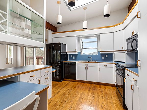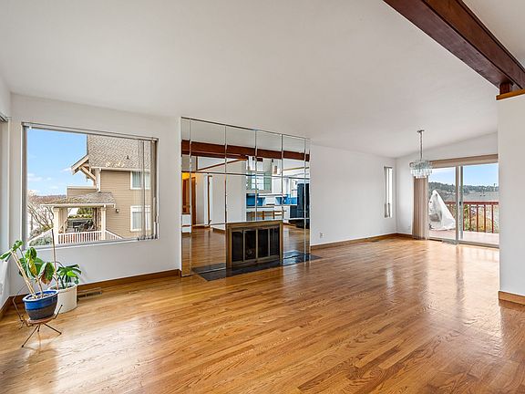 The mid-Century home features a great room concept, exposed beams, a large living space with picture windows, and a partial view of Lake Washington. Hardwood floors throughout the main level, which includes a kitchen with a skylight and breakfast bar. Cozy up next to the gas fireplace on either floor. Formal dining room with access to deck. Primary bedroom with adjoining bathroom and walk-in closet. The lower level has a large family room, 2nd full kitchen, 3 bedrooms, 3/4 bath, and storage in the laundry room. Large deck & covered patio access to the pool, hot tub, and pool-side deck. Half a block away is Kennydale Beach Park.