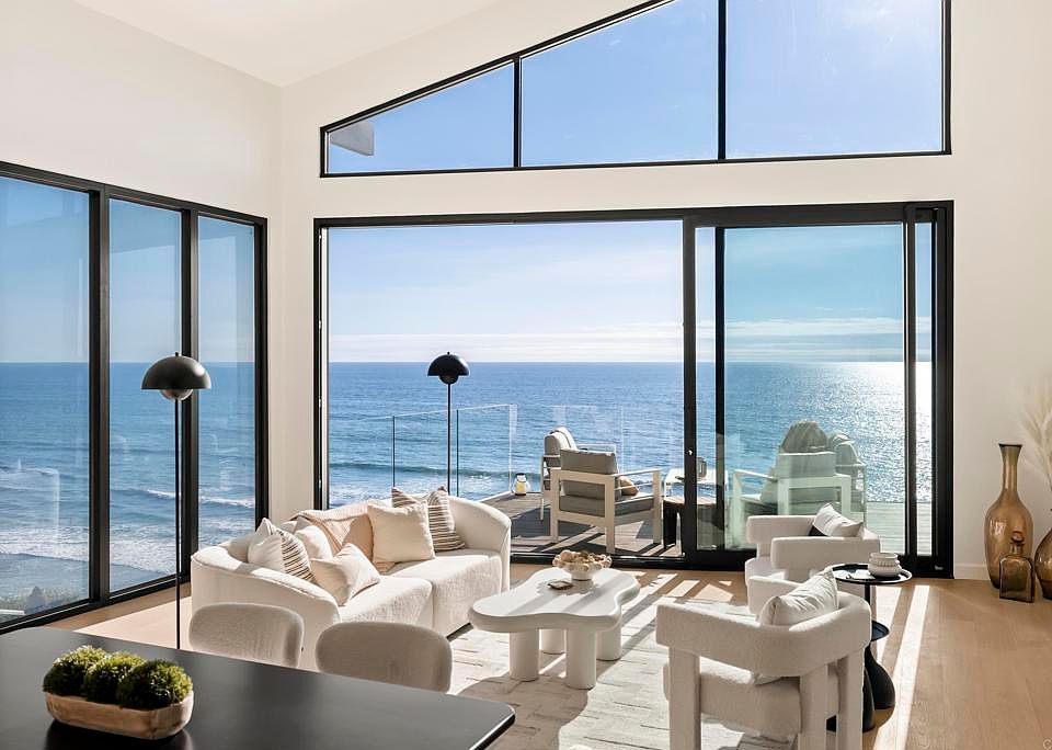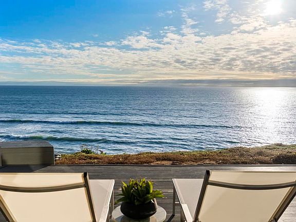 Experience oceanfront luxury at 1006 Neptune Avenue, a fully reimagined coastal masterpiece perched atop the bluff in Encinitas. Just steps from Beacons Beach, this stunning home offers effortless access to the sand, surf, and sun, making it a true sanctuary for beach lovers and those seeking the ultimate California lifestyle. Boasting three bedrooms plus a loft and four full bathrooms, this exquisitely remodeled residence showcases custom finishes by a premier luxury design-build team. Engineered hardwood floors flow throughout the home, complementing the sophisticated design and seamless indoor-outdoor living. Oversized, made-to-order aluminum sliding doors on both levels frame breathtaking ocean views, while two custom smart windows allow for instant privacy with the touch of a button. The primary suite is a private oasis, featuring floating custom mirrors over a double vanity, a spa-like soaking tub, a rain shower, and a walk-in closet—all positioned to maximize the endless ocean vistas. A second primary suite upstairs offers an ensuite retreat with a custom double vanity and an oversized soaking tub with shower. Each bathroom throughout the home is adorned with designer lighting, push-to-open custom vanities, and luxury tile, including fluted marble accents in the kitchen.