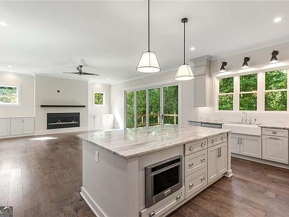 Welcome to your Wildwood haven, a 2022 custom build tucked in the heart of Buckhead on a quiet cul-de-sac in one of the neighborhood's most beloved spots where neighbors wave and kids still play outside until the sun sets. The exterior charms with warm cedar accents, glowing Bevolo gas lanterns, a slate-gray metal roofline, elegant oval windows, and classic Bradford Hall Tudor brick. Inside, an airy foyer opens to a spacious living room with treetop views of the Buckhead forest, a sleek linear fireplace, and a 14-foot panoramic glass door that extends the living space to a stained and sealed deck lit for cozy evenings outdoors. The chef's kitchen features polished Brazilian marble counters, premium KitchenAid and Bosch appliances, a farmhouse sink, walk-in pantry, and custom mudroom nearby. A main-level guest suite with a marble bath offers privacy and comfort for visitors. Upstairs, four bedrooms include a Jack-and-Jill bath and a serene owner's retreat with dual closets, spa-like marble bath, dual shower heads, and a freestanding soaking tub. Smart home tech, an EV-ready garage, tankless water heater, two-zone HVAC, premium insulation, and thoughtful storage throughout make life as efficient as it is beautiful, move-in ready and perfectly Wildwood.