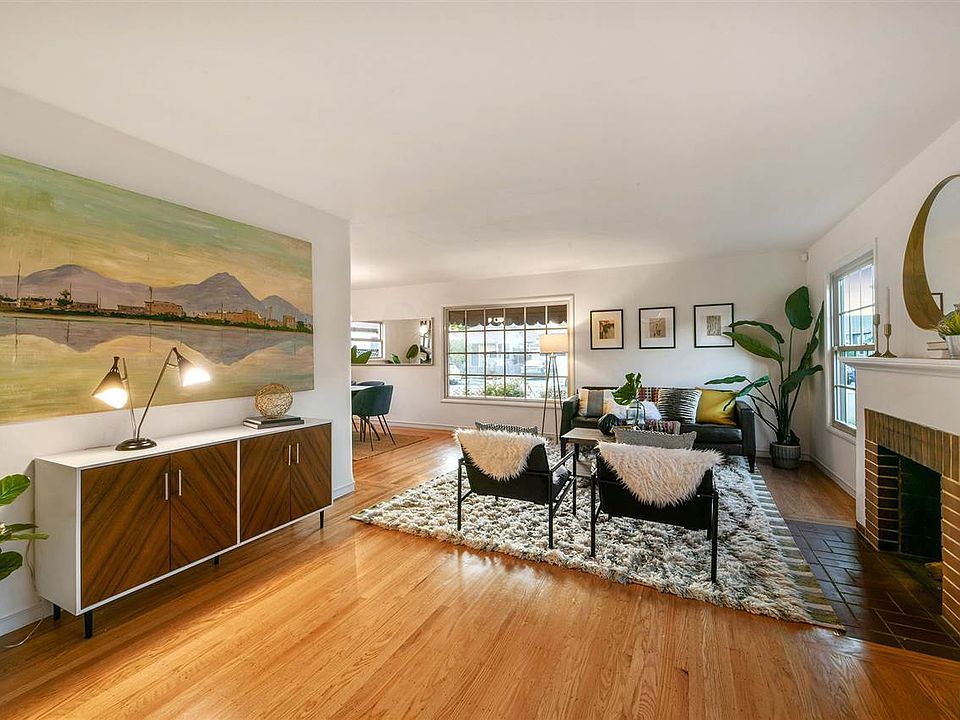 A super-charming 3BD/1.5BA single level, level-in, level-out, Mid-Century with 1442 sq ft of living space (and additional 400 sq ft garage), 1006 Post Street sits on a large lot on a quiet street in the East End neighborhood of Alameda. The home features hardwood floors, an open floor plan with updated eat-in kitchen, updated baths, formal dining area, laundry room, oversized windows, and a detached finished garage (featuring skylights and significant structural improvements) that may offer tremendous ADU potential (please verify with City of Alameda). The gated backyard includes a large patio lined by raised brick planting beds overflowing with citrus and Japanese maple trees, dragon tree plants, flowering bushes, and ground cover. This peaceful space would be ideal to entertain extended family or friends with a summer barbecue.