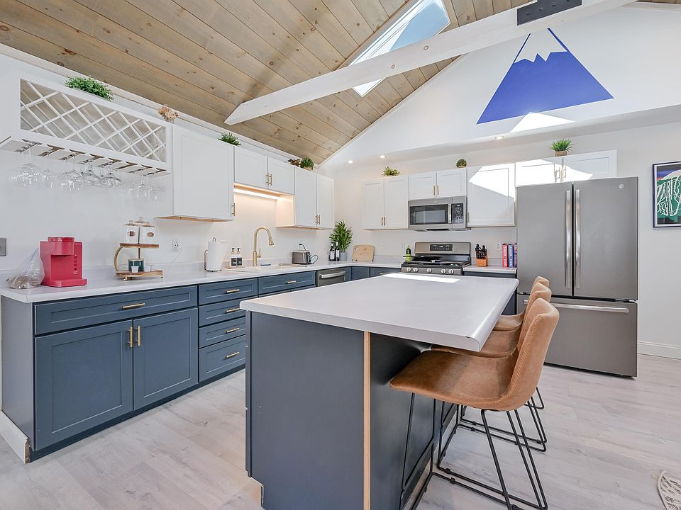 Discover this beautiful 4-bedroom, 3-bathroom multi- family home offering over 2,000 square feet of modern living space on a serene double lot. This unique property also includes a 1-bedroom, 1-bathroom in-law suite/Airbnb apartment, providing flexibility for extended family or rental income. This home features cathedral ceilings, skylights in nearly every room, upgraded appliances, and an open-concept design perfect for gatherings. An oversized 2-car garage adds convenience and ample storage. The modern features are not to be missed with exposed beams for a mountain feel, cozy step in bedrooms, bronze handles and fixtures, custom art, and a very clean, sleek living space.