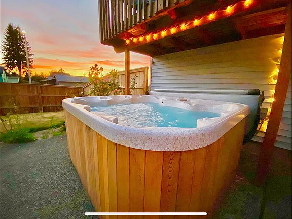 The Primary bedroom with on-suite bathroom available in a Beautiful home with a HOT TUB, 2 car garage to store your toys along with everything you need in a safe, quiet neighborhood with private back driveway, mountain views, and walking distance to amazing FOOD CARTS and DOWNTOWN TROUTDALE . Great access to Portland, Mt. Hood and Hood River. Balcony with beautiful sunsets and mountain views out the front windows. 12 parks in the neighborhood. Ride your bike to float the Sandy river on tubes, down to famous Diners, Drive-ins and dive restaurant, SUGAR PINE Drive-In. Don't miss this phenomenal place.