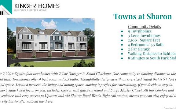 New Construction townhomes in South Charlotte, a short walk to the light rail, providing easy access to Uptown. 4 bedrooms/3.5 baths 2 car garages & 9 ft ceilings. First-floor Guest Suite has a full private bath. The main level has a kitchen with an oversized granite island, subway tile backsplash, stainless steel appliances and flows into an expansive living room, spacious dining and out to the deck. The upper level has the master suite with a luxury bath, tiled shower, dual vanity, and large walk-in closet. Only minutes to South Park, Carolina Place Mall, and the light rail.