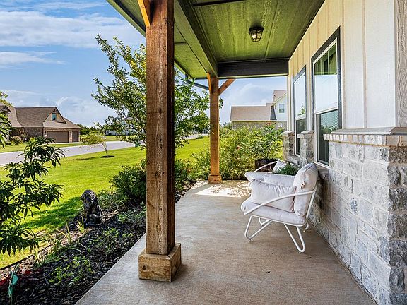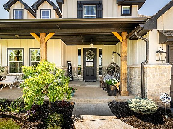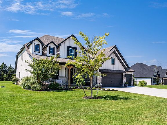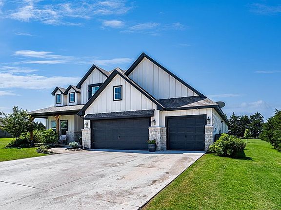 Discover your dream home in this nearly new, meticulously crafted modern farmhouse built by Beacon Homes in 2021. Boasting 2975 square feet, this stunning residence features 4 bedrooms, 3 ½ baths, and a versatile study with barn doors and a storage closet. The spacious, open floor plan connects the living room, kitchen, and dining area, all highlighted by beautiful oak wood floors, a brick fireplace, and wood ceiling beams. The gourmet kitchen is a chef’s delight, with a large island with a breakfast bar, a gas cooktop, quartz countertops, and a spacious walk-in pantry. The luxurious primary suite on the main floor offers a vaulted ceiling, a scenic backyard view through expansive windows, a ceiling fan, a double vanity, a soaking tub, a shower, and a generous closet. Additional features include a tankless hot water system, a water softener, an in-ground storm shelter, and a 3-car garage. Enjoy outdoor living with a large covered front porch and a covered back patio featuring an outdoor fireplace. This home also has 2 bedrooms downstairs and 2 bedrooms with a bath upstairs, providing ample space for family and guests. The beautifully landscaped yard is complemented by a water well and an aerobic septic system, ensuring sustainability and convenience. Located at N Penn and Waterloo Rd in Logan County, this Edmond address falls within the prestigious Deer Creek School District, offering easy access to Hwy 74, shopping, and dining. This property, situated in a tranquil cul-de-sac, offers the perfect blend of luxury, comfort, and convenience. Don't miss out on this exceptional opportunity to make this house your home.