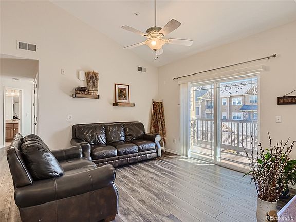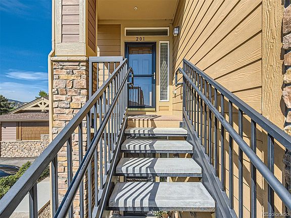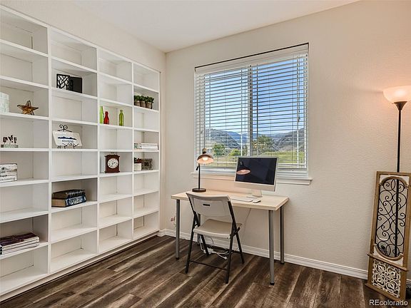 Immaculate condo in southwest corner of Chatfield Bluffs with views of the foothills and just steps away from Deer Creek Canyon and views of Chatfield Reservoir and Denver Botanic Gardens. Second floor corner/end unit with generous south-facing sunshine that allows you to open the sliding glass door or be outside on the covered deck on those Colorado wintry days when the temperatures say you should be inside. Vaulted living space with no one above you! Spacious kitchen and dining space with island for additional seating, stainless steel appliances and pantry. Glass door double entry to office/study (or non-conforming bedroom) with built-ins. A very quiet work-from-home space. Primary bedroom is vaulted and features double closets, ceiling fan, and full bath with double sinks and soaking tub...and no one above you! Full bath plus additional bedroom. Laundry closet is convenient and washer/dryer are included. No through traffic and wide access to the detached garage just steps away. Generous parking spaces for guests nearby. Take advantage of the lower taxes this building enjoys in contrast with the surrounding new construction. Move-in ready!