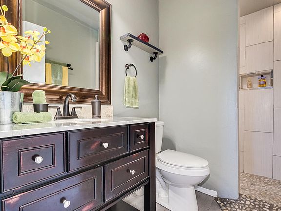 Gorgeous single-story 2 bedrooms, 2 baths home in sought after Vail School District. Flowing ceramic wood look flooring throughout, no carpet! Huge living room, front den/office space, dining area right off the kitchen, custom paint colors throughout and recessed lighting. Updated kitchen boasts upgraded SS appliances, gas range,gray& white cabinetry, polished epoxy counters tops. Laundry room complete with washer and dryer, built-in storage cabinets, spacious bedrooms, and tiled shower/tub combo in the hall bath. Peaceful master retreat with immaculate ensuite, tiled shower with pebble floor. Large garage has epoxy flooring with built-in shelves and ample backyard with covered patio with cobblestone patio, firepit and synthetic grass. Don't delay, schedule a showing today