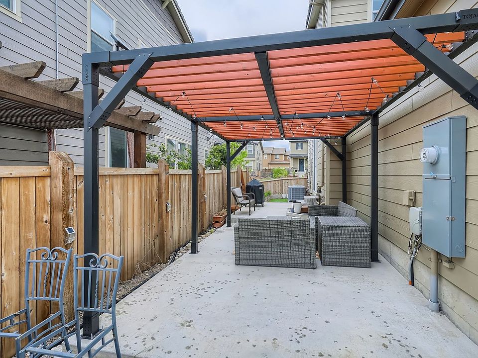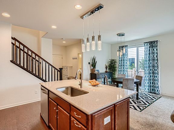 This Meridian Village townhome is not to be missed! All the appeal of a single family home with the benefits of minimal maintenance townhome living. Plus the convenience of prime location in between desirable downtown Parker and easy access to I-25. Beautiful, durable and well maintained home creates a modern flow in the main living area. The sleek kitchen comes complete with dark maple cabinetry, cooktop, stainless steel appliances and large Quartz counter island. Retreat to the sunny, primary bedroom with walk-in closet and on-suite bathroom, featuring upgraded faucets and spacious shower. Two more spacious bedrooms which one of them can be used as an office room, full bathroom and well organized laundry room complete the upstairs. The full, unfinished basement has plenty of potential with rough-in plumbing already in place. Enjoy sunrise on the covered front porch or picnic and play in the private side yard, which includes concrete patio for entertaining, large pergola for relaxing and just enough artificial grass for playing with NO maintenance. The Meridian Village neighborhood offers a community pool, multiple parks and lots of walking trails to enjoy. Link to virtual tour: