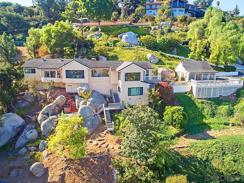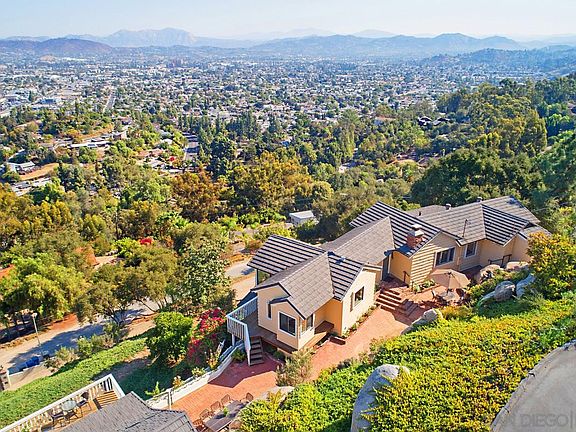 Rare Mt. Helix garden cottage. Beautiful character & original charm featuring vaulted beam ceilings in great room, dining room & breakfast nook. Large picture windows showcase stunning panoramic mountain/evening lights view & bright natural light. Darling vintage main level bath. Well-designed kitchen with garden view. Private lot with detached guest house with own bath & kitchen. Spacious view terrace & balcony with surrounding gardens & brick patios for entertaining. A gem!