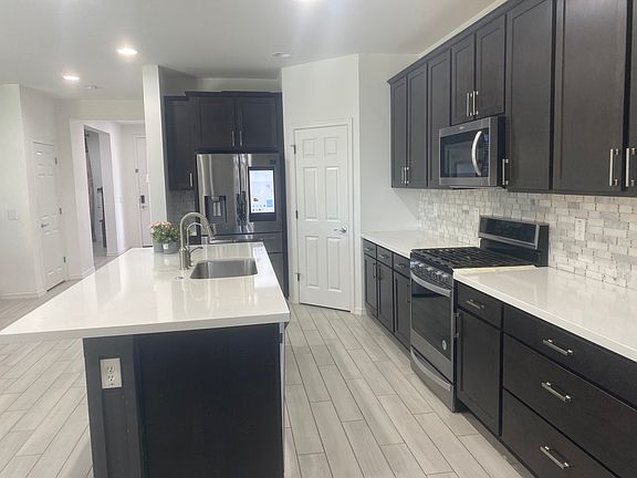 5-bed, 3.5-bath home is in the highly sought after Eastmark Community . This home Provides mature landscaping and a 2-car garage. Fabulous interior showcases a perfectly flowing open layout paired with bright living & dining areas, neutral and some custom paint. Lovely light fixtures, and wood-look tile floors w/carpet in all the right places. One bedroom and full bath wiith walk-in closet downstairs. You'll love the chef's kitchen with sleek SS appliances, plenty of cabinets, a walk-in pantry, marble counters, grey and white subway tile backsplash, and an island w/breakfast bar. Head upstairs to find a good-sized loft & 4 large bedrooms w/walk-in closets! These bedrooms are large enough to fit California King beds. Main bedroom offers an ensuite w/dual sinks and huge closet.The backyard beckons with mature landscaping and lush real grass, providing a serene outdoor oasis for leisure and entertaining. Just like a world-class resort, this community offers a luxurious community pool, splash pads, numerous parks spread throughout