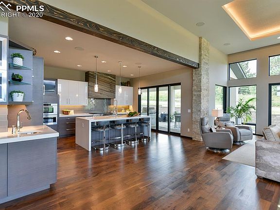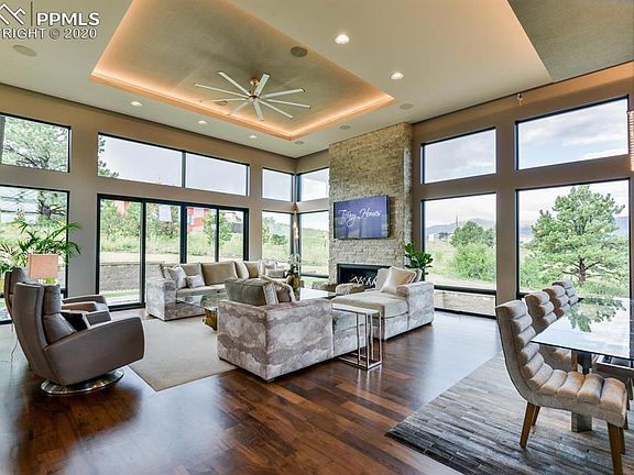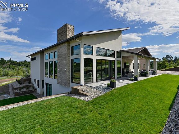Award winning 'Tiffany Home' nestled on 2.5+ acres in a secluded enclave within 1 mile from I-25, Powers and HWY 83. County living in the city affords privacy, views and Kettle Creek running through the lower edge of the property. "Colorado Divinity" offers an intriguing mix of sophisticated man-made materials and natural organic elements. The open floor plan with expansive volume ceilings, floor-to-ceiling windows, and high-end finishes leads you to sweeping views of the Front Range. ***SEE SUPPLEMENTAL REMARKS*** The main level features a great room/dining room/kitchen combination. The kitchen is a visual feast for guests and a gourmet playground for the serious chef.Quartz countertops and natural walnut cabinetry contrast elegantly against glossy white accent cabinets, while the suspended Quartzite "Sequoia" hood steals the stage as the focal point of the kitchen. The master suite reveals a frameless three-sided glass fireplace with a floating wood and concrete hearth; the master bath presents a dramatic waterfall vanity, TV hidden behind mirrors, a chrome free-standing tub that fills from the ceiling, and a walk-in shower with a floating bench and dual shower heads. A dramatic single-spine walnut stairway leads to the walk-out lower level - a multi-functional space boasting an open theater that easily seats 20, a pool table, wine storage, a media wall, walk-behind bar, and built-ins. Two additional ensuite bedrooms, an additional laundry room, storage space with a fire safe vault, and a additional stairway to the upper-level garage complete the lower level. A contemporary jewel box in a dignified country setting - "Colorado Divinity".