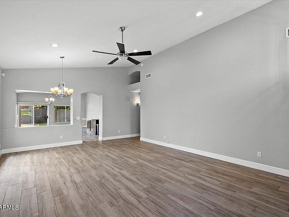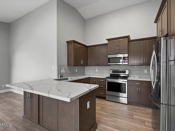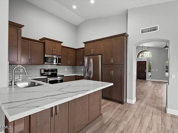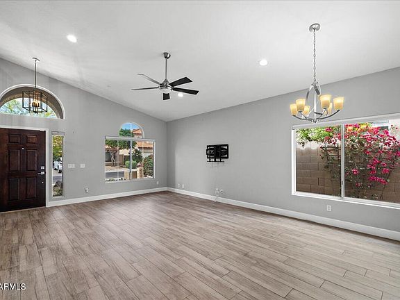 Beautifully updated home with newer kitchen cabinets, quartz countertops, stainless steel appliances including counter depth LG French door refrigerator and breakfast bar. Wood look tile flooring in all living areas and halls, updated lighting and remote operated pleated shades for the windows. Master suite has double door entry, wall mounted TV, sliding door with remote operated pleated shades. The master bath has a luxurious shower, upgraded cabinets and quartz counters and walk in closet. Outside you'll find a covered patio, synthetic grass and desert landscape. Washer/Dryer included as well as ring doorbell/cameras. Epoxy floor in the garage and extra storage area. Community offers a heated pool and spa and is within walking distance to restaurants, shopping and parks.