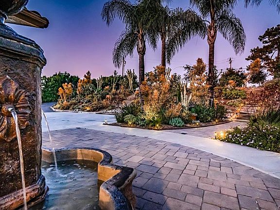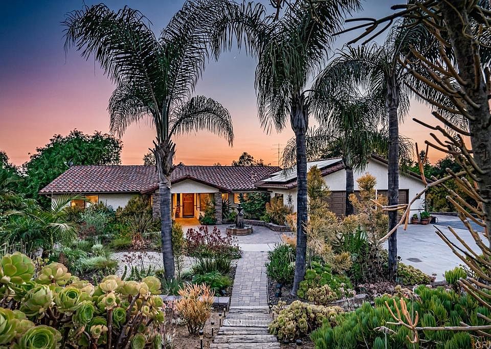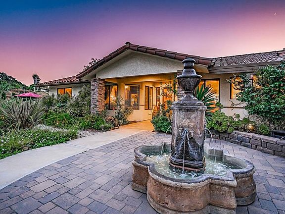 Escape to tranquility in this stunning 3-bedroom, 2.5 bath single-story home nestled on a private 2.46-acre lot in Escondido! Completely remodeled in 2015, including a tile roof and a fully paid off solar system, this home offers modern luxury with a touch of Southwestern charm with nightly sunset views over the beautiful hills of San Diego. Step inside an expansive, open concept living space, adorned with Saltillo tile floors, and a large stone fireplace to create the perfect ambience. The gourmet kitchen features granite countertops, custom pine cabinets, a large copper farmhouse sink, and a Mexican tile backsplash that adds a touch of tradition. The central island boasts three oversized pull-out drawers for convenient storage, an additional copper sink, fully equipped with a second garbage disposal, and enough bar seating for 4 guests. A pine pantry with five deep shelves ensures ample storage and a dedicated coffee/bar counter includes a built-in wine fridge. The home features 3 spacious bedrooms, plus an additional room off the living area, perfect for a home gym or office. The primary bedroom includes a walk-in closet and a sliding glass door which opens to a private patio. Perfect for sipping a morning cup of coffee, or to enjoy a beautiful sunset right from the comfort and privacy of your bedroom. The primary bathroom features dual vanities with copper sinks, pine cabinets, granite countertops and a spacious walk-in stone shower with built in jets and a granite seat. Venture outside and be surrounded by a private paradise. The front yard landscaping, revamped in 2023, features a large succulent bank, pebble paths, California-friendly plant selections and a large fountain adds a touch of serenity. Well-established fruit and avocado trees provide a homegrown bounty year-round. Other features include: an expansive 3 car garage, new HVAC system (2021), electric front gate, freshly painted exterior, brand new screens on windows and sliding doors, RV parking with full hookups and dump station, fully fenced property line, two outdoor storage sheds, a gazebo in the lower backyard, and beautiful views from every interior window. This property offers endless potential, plenty of land for horses, an ADU, a vineyard, or whatever you can dream! Don't miss your chance to own this private paradise!