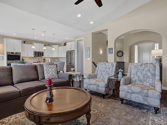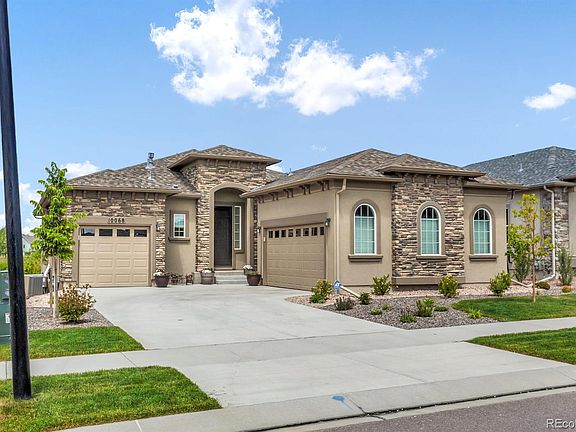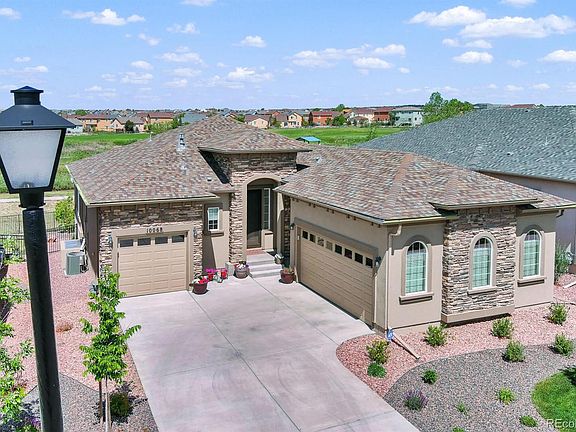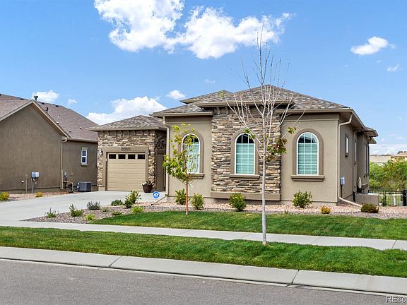 This immaculate rancher is like-new with stunning mountain views & central air to keep you cool! The main level features a spacious living room with wood floors, 9+ ft ceilings, gas fireplace, and tons of windows! The kitchen includes stainless steel appliances, quartz counters, island, walk-in pantry, and double oven for all of your cooking needs! The dining room has walk-out access to the back deck. Enjoy your main level master suite with walk-in closet, attached 5 pc bath and door to back deck. A second bedroom with adjoining full bathroom is also on the main level. The spacious laundry room also serves as a mud room off of the garage. The garden level finished basement features two additional bedrooms, a full bath, a wet bar, a large rec room, and a separate family room. This space has unlimited possibilities-- an office, theater room, gym, or second living space. There is also a large unfinished utility room with ample storage and water filtration system. Sip coffee or wine on your back deck with motorized, retractable awning. Situated in Stonebridge at Meridian Ranch with an abundance of amenities such as parks, community garden, hiking trails, and a private clubhouse. No rear neighbors and backs to park and golf course! Plenty of parking with attached 2 car garage plus a separate attached 1 car garage (3 total!). Minutes to golf, shopping, restaurants, and Woodmen for commuting!