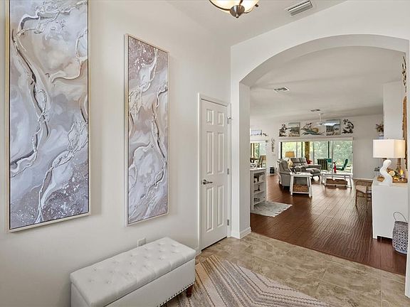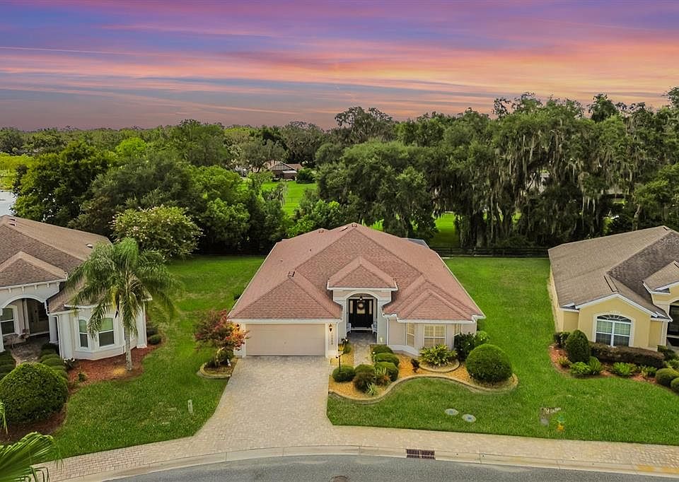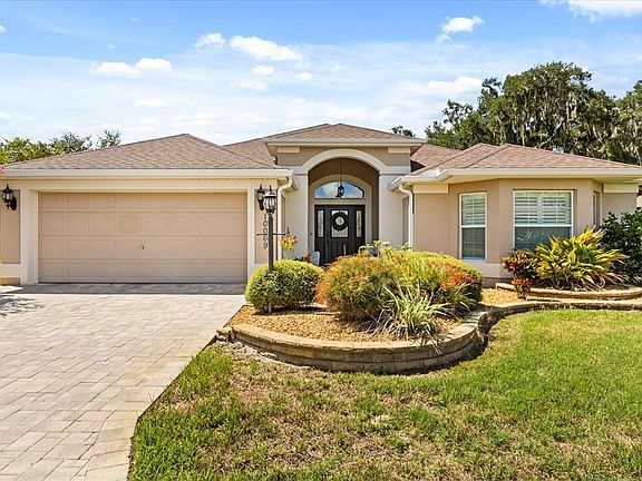 This beautiful home offers a rare combination of privacy, space, and resort-style living. Nestled on a pie-shaped homesite backing to a charming 4-board fence, there’s ample room for a future pool — and with a sneak-a-peek of Lake Miona, the view would be even more impressive with a pool or birdcage addition. The exterior features brick paver walkways, stacked stone accents, and low-maintenance landscaping with rock-filled flowerbeds. Inside, you’ll find large ceramic tile in the wet areas and wood laminate flooring throughout the rest of the home — no carpet — and plantation shutters on all windows. The kitchen is a showstopper, boasting white cabinetry with pullouts, stainless steel appliances (including a glass-top range), granite countertops, tile backsplash, under-cabinet lighting, and stylish pendant lights. The primary suite offers a tray ceiling and a spa-like bath with dual vanities and a walk-in shower. Pocket sliders lead to an oversized lanai with brick paver flooring and an added birdcage, perfect for soaking up the Florida sun. Remote controlled power blinds are located on all of the sliders. The extended 2-car garage — an extra 4 feet forward — provides plenty of space for vehicles, golf carts, and more. Located in Lakeside Landings, a sought-after gated community just minutes from The Villages and Lake Miona, residents enjoy an impressive array of amenities: a 13,000+ sq. ft. clubhouse, resort-style pool and spa, fitness center, pickleball and tennis courts, bocce ball, putting green, and a private beach with dock access to Lake Miona. There’s also a dog park, walking trails, and an active social calendar, making it easy to enjoy the Florida lifestyle to the fullest.