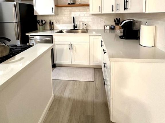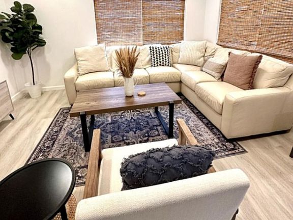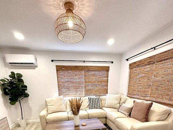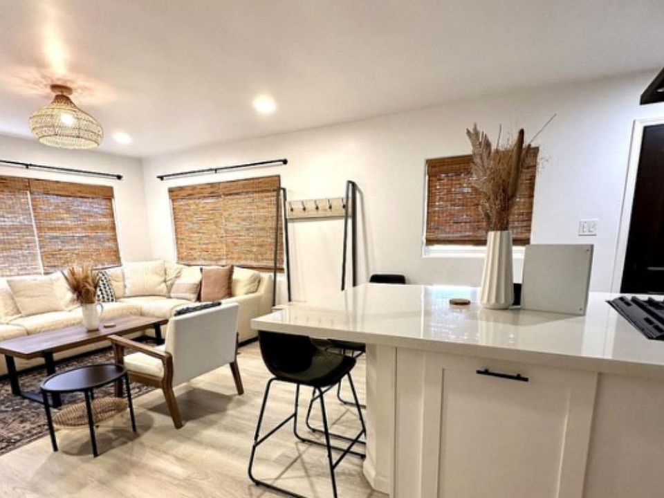 Discover coastal living in this charming Imperial Beach home. Feel at home in this inviting space featuring two bedrooms: the master with a luxurious king-size bed, ample storage, and cozy lighting, and the second bedroom with a bunk bed, dual closets, and a versatile desk area. The well-appointed bathroom is conveniently located nearby, featuring a regular shower, vanity with drawers, and essential mirror. The heart of the home is the open-plan kitchen, equipped with modern appliances including a blender, toaster, and coffee maker. An inviting island with stools and a nearby pantry offer ample storage. Adjacent, the dining area comfortably seats four. Relax in the living room, complete with a TV and stylish furnishings on easy-care laminate flooring. Step outside to a serene backyard with patio seating and a maintained lawn, perfect for outdoor grilling. Security is ensured with ring cameras. This delightful home is your gateway to the California dream, located in the charming neighborhood of Imperial Beach. A laptop computer is not included.