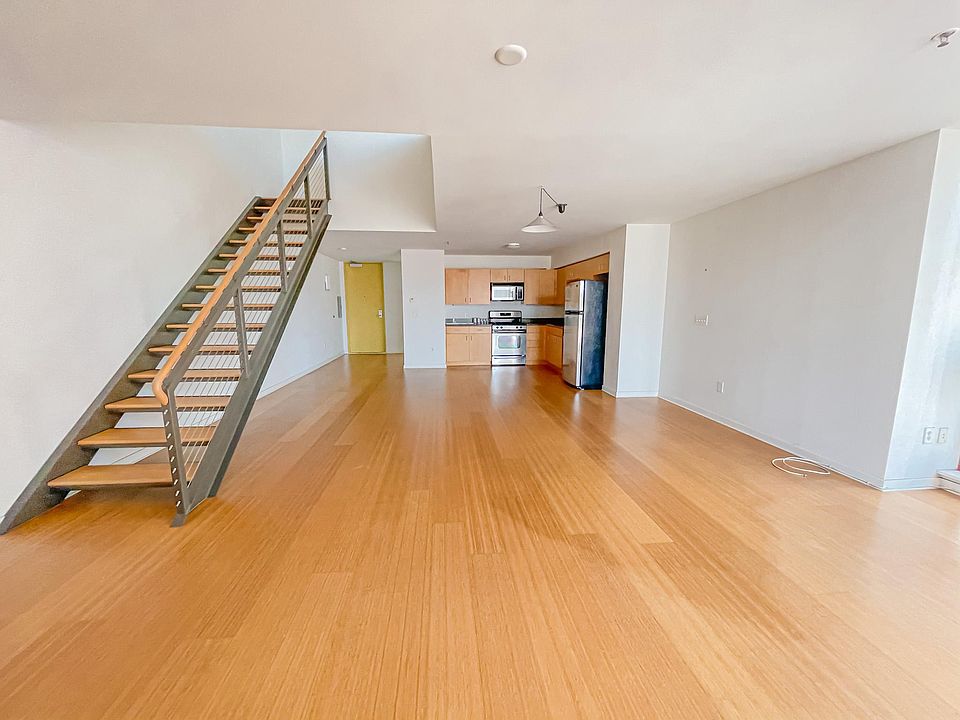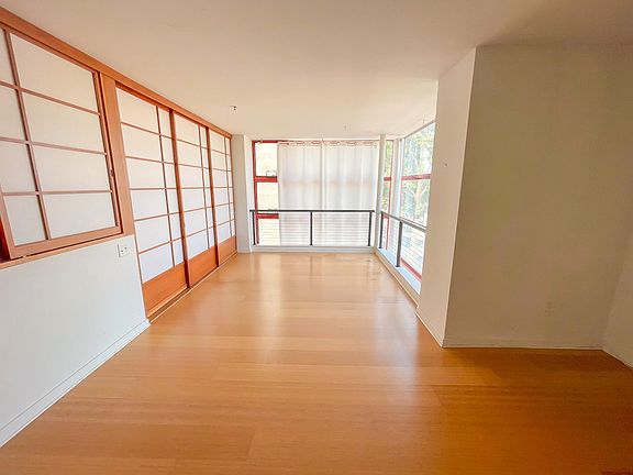 Freshly painted home with beautiful high ceiling windows which will provide abundant natural lighting. A modern and sleek loft-style interior makes for a unique living experience. Both bedrooms are on the second floor, one which has an elegant Japanese sliding door and window. The second bedroom is carpeted and directly connected to the bathroom and walk-in closet. The loft is located in a secure gated community with an elevator, in-building mailbox and garbage disposal, and garage parking. There are multiple courtyards located within the community for socializing between friends and neighbors. Multiple parks, restaurants, and shops within walking distance makes for a walker's paradise.