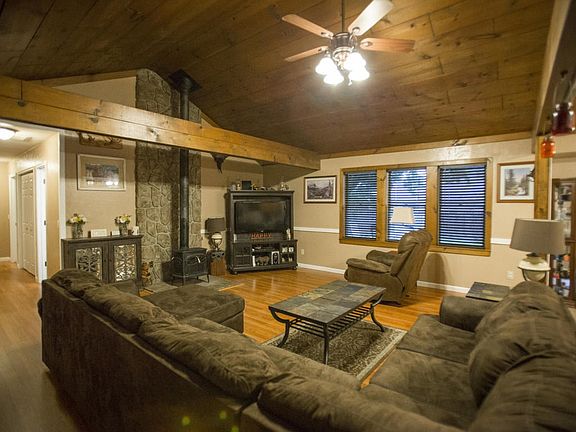 Wonderful home for those rustic lovers! This home features pine clad ceiling and a vaulted living room with an open floor plan. Wood burning stove helps with the efficiency of the utilities in winter, utility bills are low. The kitchen has a center, butcher block island, stainless appliances and is open to the living room. Some updates include: 2011 Furnace and hot water heater replaced, new laminate flooring in living room, exterior house repainted recently and a new ROOF will be installed prior to closing. Back yard is privacy fenced and has a HUGE stamped concrete patio and a fire pit! Close to grocery store and elementary school. Call to see this home!