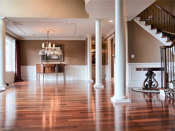 Custom built 5 BR 5.5 BA brick home. 2 story foyer w/trey ceiling, flooded w/natural light & Brazilian cherry floors. Main level boasts 10’ ceilings & HW. Stunning staircase w/wrought iron spindles & crown molding. Vast windows, intricate ceiling, wainscoting, columns & crown molding are highlight in the LR & DR. Wall of windows overlook the rear deck & yard in the FR, w/custom built ins & FP. Ample custom cabinets, backsplash, HW, butler’s station & casual eat in dining area compliment the kitchen. Bright & spacious den adorn w/custom built-in shelves & private access to rear deck & exterior. 2nd level Owner's suite w/vaulted ceiling, jet tub, crown molding, neutral décor & natural sunlight. Vaulted ceiling, en-suite bath, ample closet space & natural light are 3 guest BR. 2nd level hosts bonus space/5th BR. Finished LL w/custom FP, workout room, full bath w/steam shower, custom bar & WO access to rear composite deck & stone patio leading to large level yard.