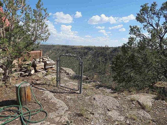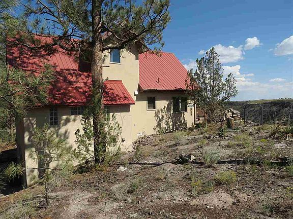 Contemporary stuccoed home perched high on the edge of Pueblo Canyon. Composite wood decks on front and back of house. Outstanding views of the Sangre de Cristo Mountains and the Jemez Mountains. Access to trails in Pueblo Canyon. Metal roof and insulated windows. Three stories, each with a bedroom and bath. Top story also has a loft/office w/magnificent views. Middle level has large living room w/wood stove, dining room, eat in kitchen, bathroom and Master Bedroom. Lower floor has bedroom, bath and laundry room. Wood floors throughout most of the house. Some new appliances in kitchen. Very special house at a very special price.