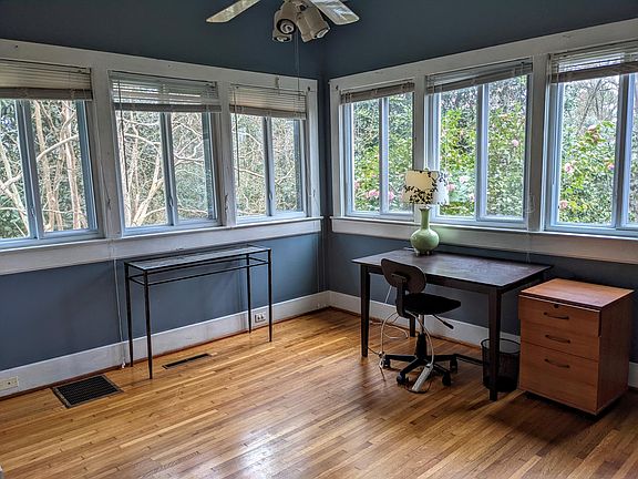 *Available for the summer or through the fall (roughly May-July, or May-December), slight flexibility on dates* High speed wireless internet, electric, gas, and water all included in rent. More photos available upon request. Conveniently located in the Duke Park neighborhood less than two miles to downtown Durham and 15 min to RTP, this updated historic home is a great base from which to explore the Triangle. Relax in the huge, private yard or around the fire pit. Built in the 1920s, this 1,500sq/ft house is brimming with historic charm but is modern where you need it: a beautifully remodeled kitchen and bathroom as well as original glass doorknobs and refinished hardwoods floors throughout, a wood burning fireplace in the living room, and 10-foot ceilings and large windows offer lots of light. Central heat/air. Rooms: two bedrooms, one office, one bathroom, dining room, living room, kitchen, screened in side porch, laundry room in the basement. Kitchen is equipped -- also includes microwave and toaster oven. The home is less than two miles from downtown Durham but sits on a rare one-acre lot, so feels very private, while still conveniently close to everywhere you'd want to go. The living room has a 47" Smart TV and an xbox. In the backyard there is a fire pit and lawn chairs, sandbox and toddler slide, as well as many flowering trees and garden beds. There are ceiling fans throughout the house. There is plenty of space to park two cars side by side in the driveway, as well as free street parking. There's a washer and dryer in the basement. The front bedroom has a queen bed, nightstands and lamps, closet, ceiling fan, a dresser, and an ornamental fireplace. The back bedroom has a queen bed, nightstands and lamps, two closets, a ceiling fan, and a dresser. The office has two walls of windows (6 windows) overlooking the backyard and tons of beautiful light, a large table, an office chair, a desk lamp, and a four-drawer desk cabinet. High speed internet and all utilities (gas, electric, water) are included in the rent. No pets, no smoking indoors or outdoors, no parties.